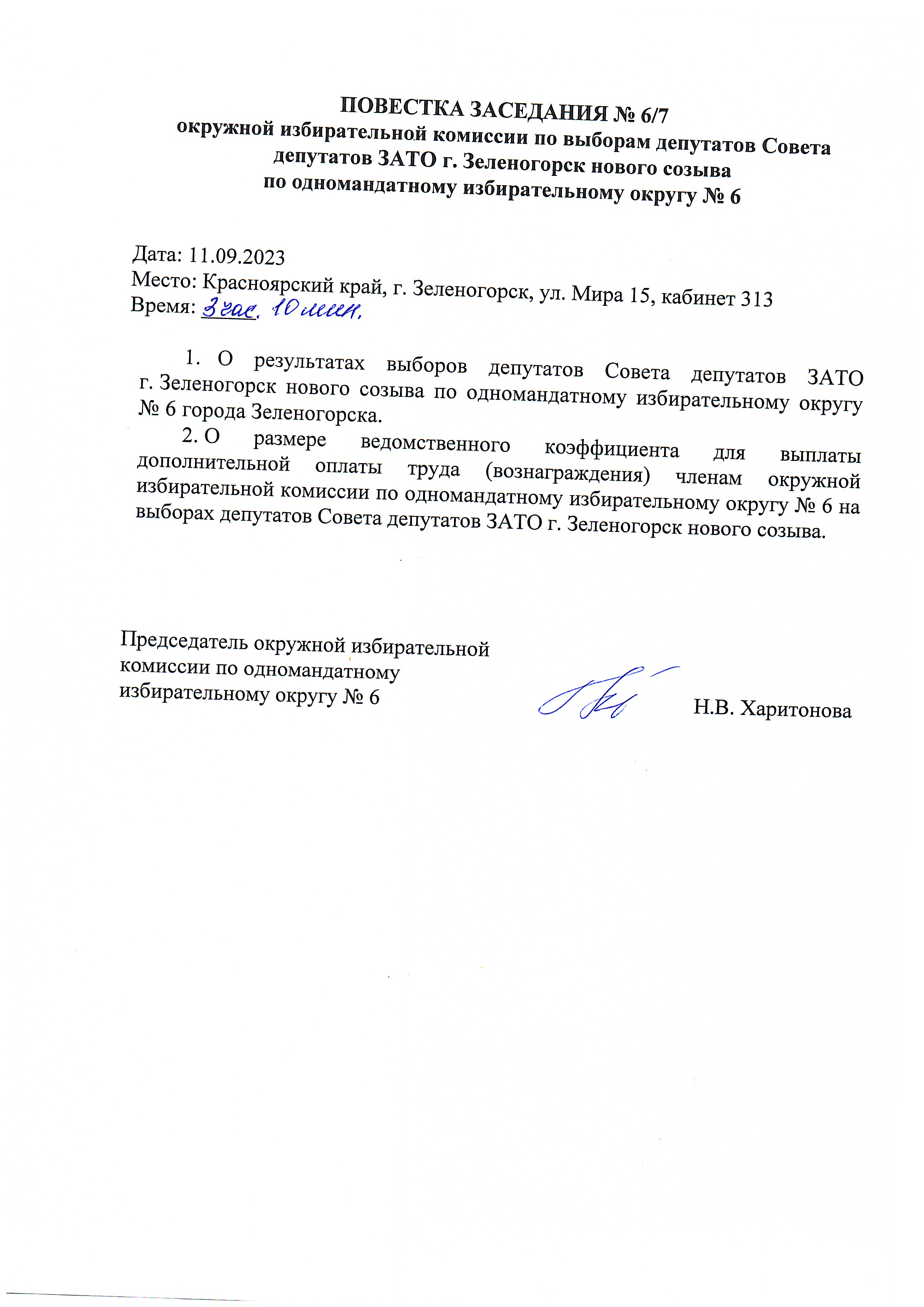 17.08.2023 с 17.55 в кабинете 106 Администрации ЗАТО г. Зеленогорск состоится заседание окружной избирательной комиссии № 6